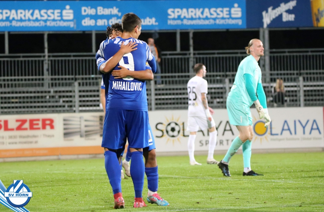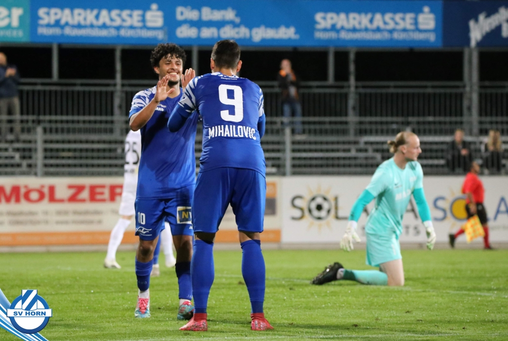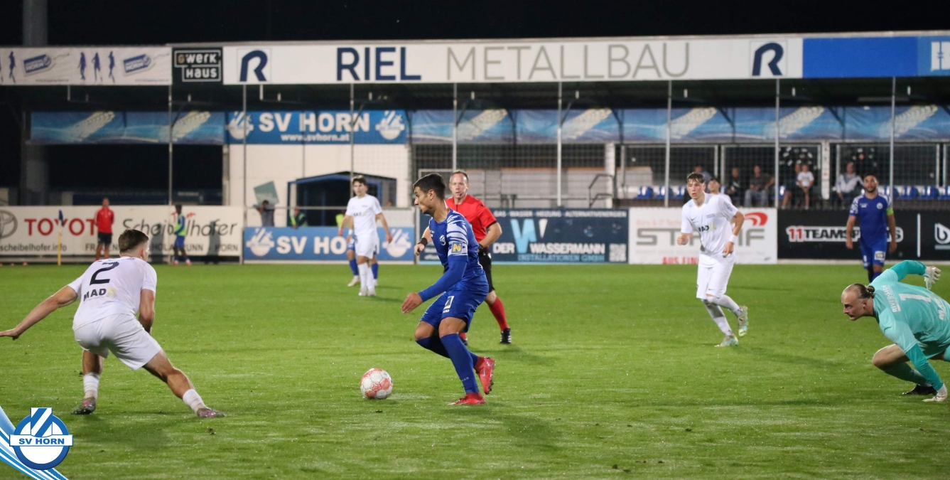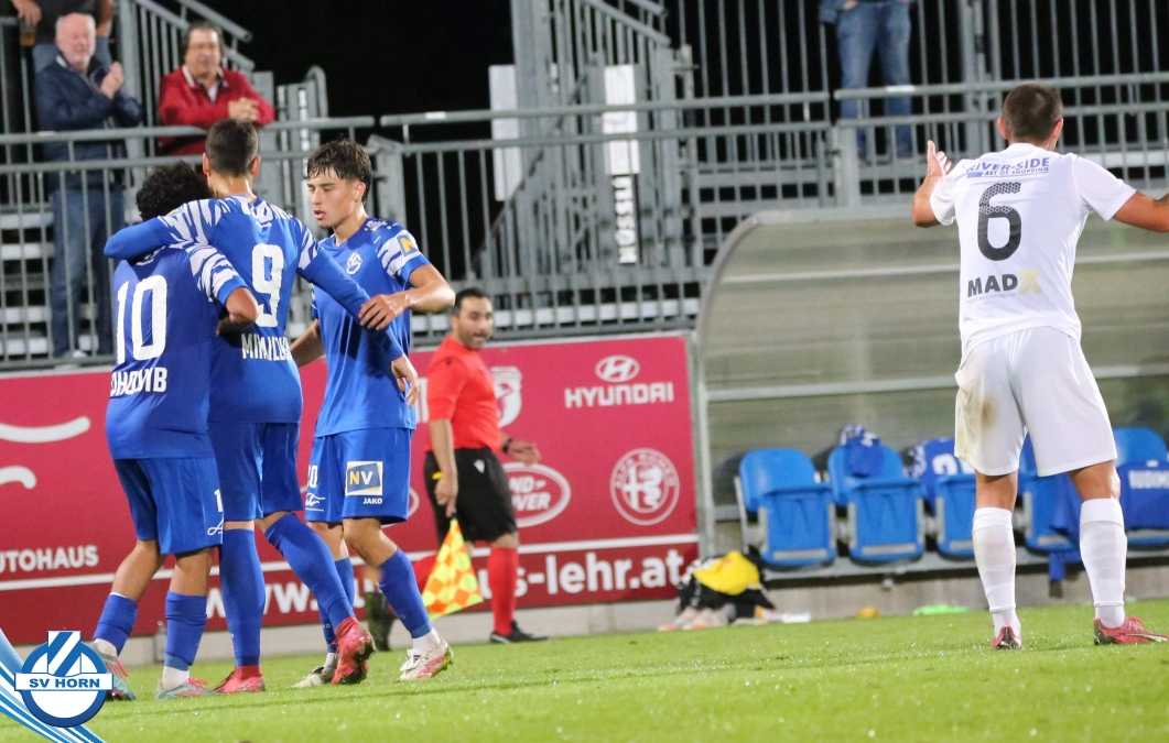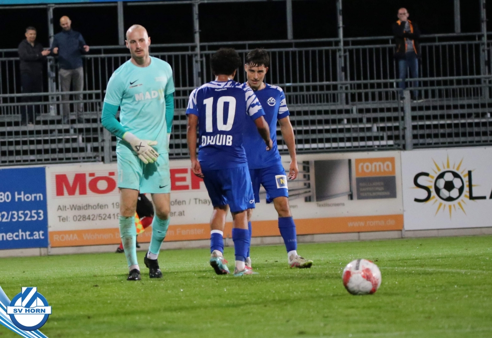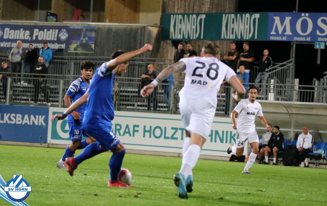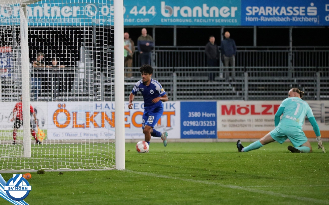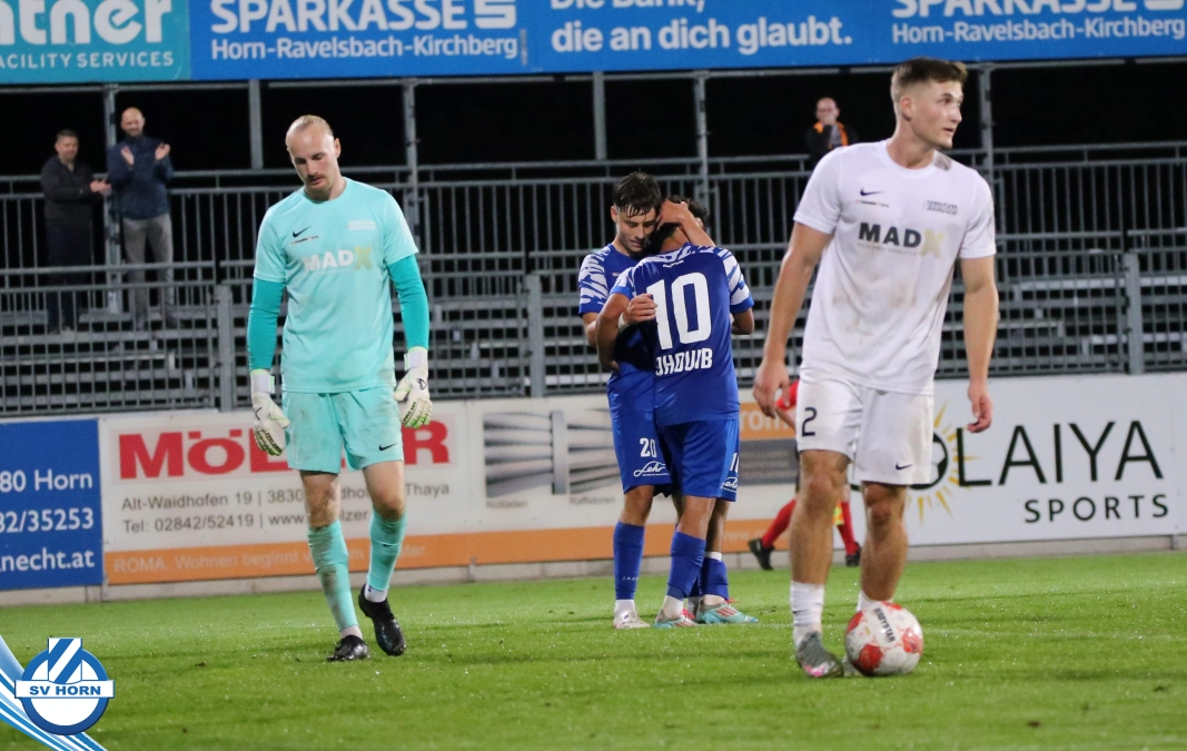 Auch in Halbzeit 2 dasselbe Bild. Horn ist spielerisch überlegen und hat gleich wieder gute Gelegenheiten, trifft aber zunächst nur den Pfosten. Die Gäste wollen jeden Ball von hinten herausspielen und schlagen keinen Ball ab - daraus resultiert das 3:0 - Karim Dhouip erkämpft sich den Ball von der gegnerischen Abwehr und versenkt mit einem Schuss ins lange Eck zum 3:0. Das 4. Tor ist fast ein Spiegelbild des 4. Treffers mit einem Ballgewinn im Strafraum der Gäste von eienem Verteidiger - wieder holt sich Karim Dhouip den Ball vom Gegner - umspielt diesmal noch den Torhüter und schießt ein. Das 5:0 ist dann wieder eine richtig schön heraus gespielte Aktion, wo sich Zoran Mihajlovic im Strafraum der Gegner durchsetzt und zu Dhouip zurücklegt, der den Ball zum lupenreinen Hattrick versenkt. Den Abschluss des Torreigens macht schließlich wieder Zoran Mihajlovic: er versetzt den herauslaufenden Torhüter außerhalb des Strafraums, kann auch am Leibchen nicht mehr gehalten werden von einem Verteidiger und schießt unwiderstehlich zum 6:0 ein.