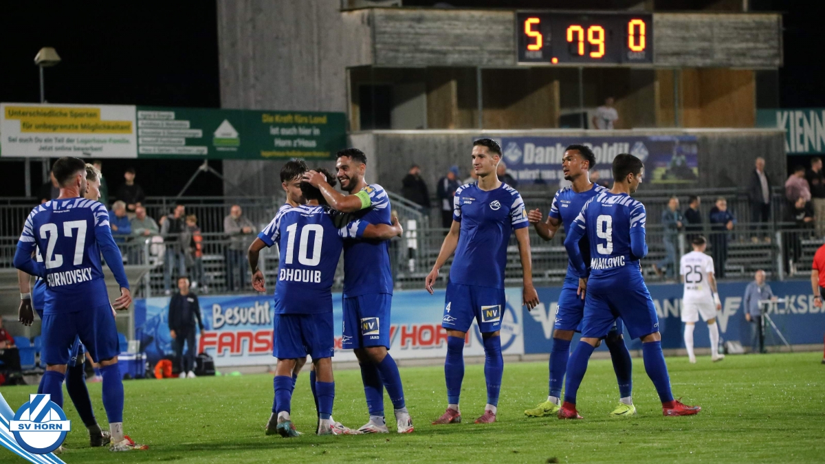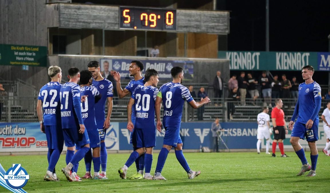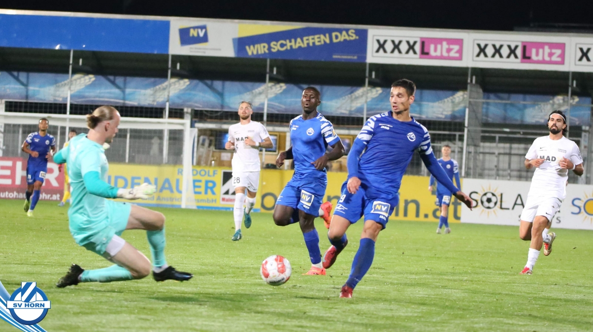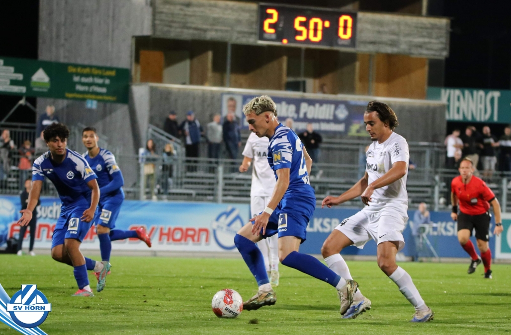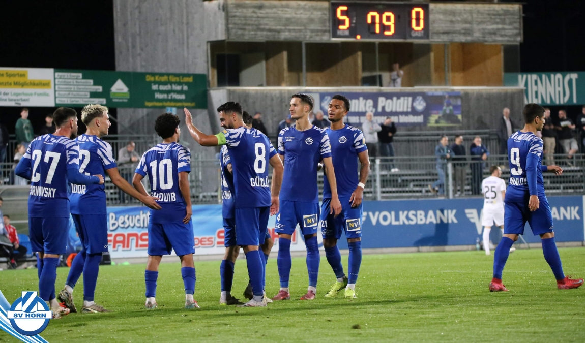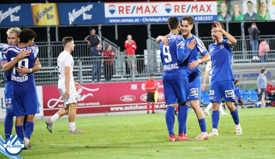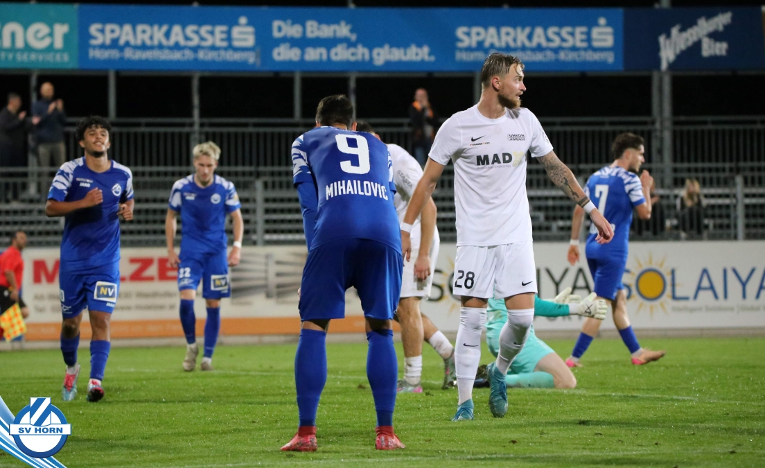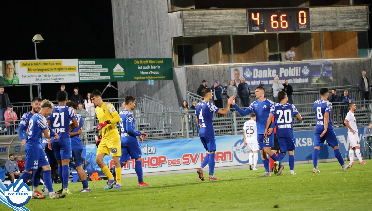 Auch in Halbzeit 2 dasselbe Bild. Horn ist spielerisch überlegen und hat gleich wieder gute Gelegenheiten, trifft aber zunächst nur den Pfosten. Die Gäste wollen jeden Ball von hinten herausspielen und schlagen keinen Ball ab - daraus resultiert das 3:0 - Karim Dhouip erkämpft sich den Ball von der gegnerischen Abwehr und versenkt mit einem Schuss ins lange Eck zum 3:0. Das 4. Tor ist fast ein Spiegelbild des 4. Treffers mit einem Ballgewinn im Strafraum der Gäste von eienem Verteidiger - wieder holt sich Karim Dhouip den Ball vom Gegner - umspielt diesmal noch den Torhüter und schießt ein. Das 5:0 ist dann wieder eine richtig schön heraus gespielte Aktion, wo sich Zoran Mihajlovic im Strafraum der Gegner durchsetzt und zu Dhouip zurücklegt, der den Ball zum lupenreinen Hattrick versenkt. Den Abschluss des Torreigens macht schließlich wieder Zoran Mihajlovic: er versetzt den herauslaufenden Torhüter außerhalb des Strafraums, kann auch am Leibchen nicht mehr gehalten werden von einem Verteidiger und schießt unwiderstehlich zum 6:0 ein.
