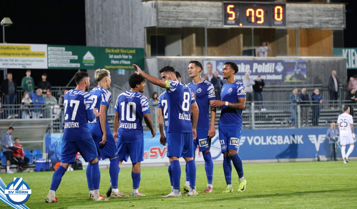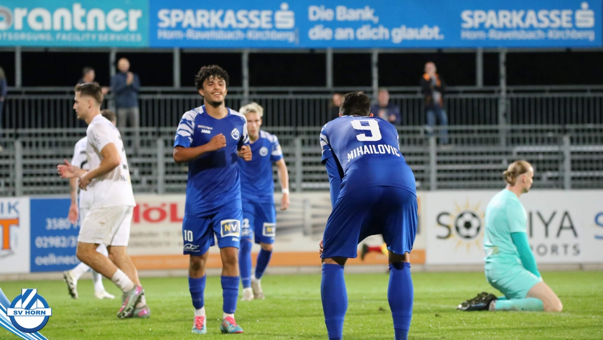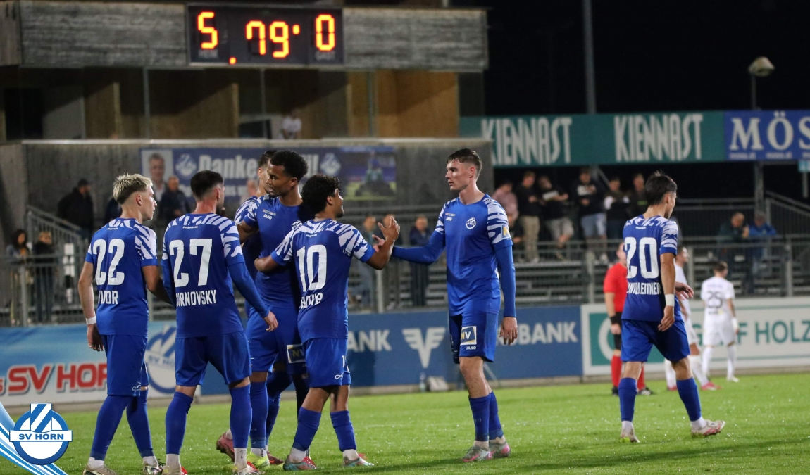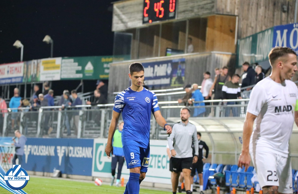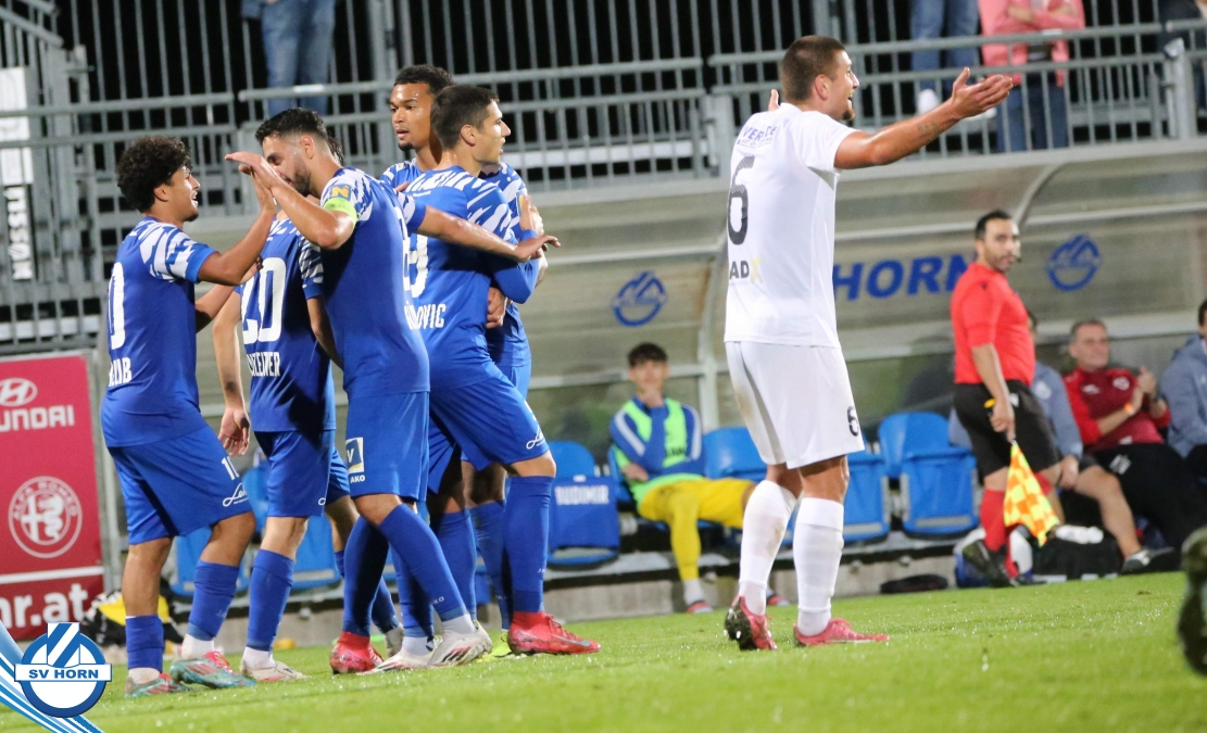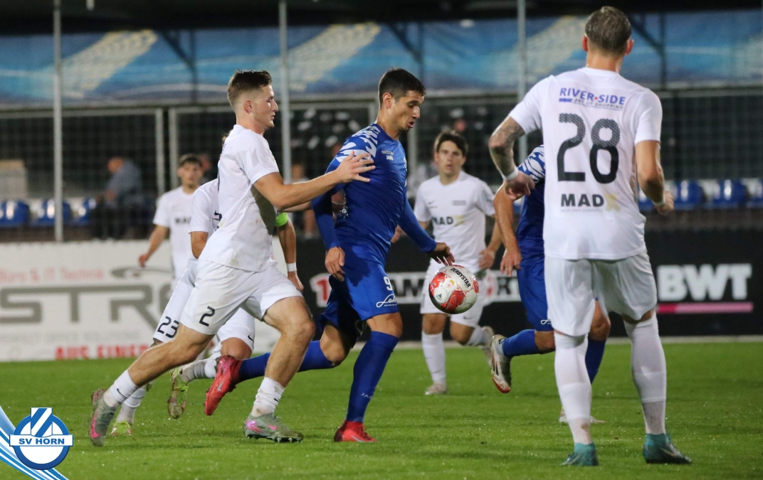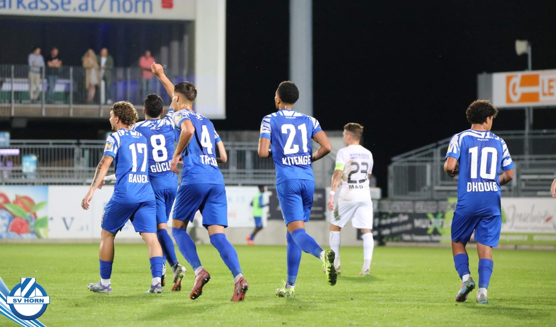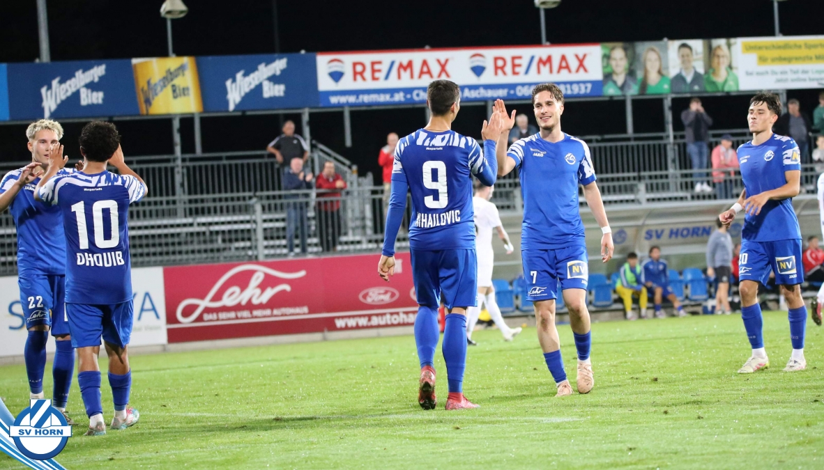 Auch in Halbzeit 2 dasselbe Bild. Horn ist spielerisch überlegen und hat gleich wieder gute Gelegenheiten, trifft aber zunächst nur den Pfosten. Die Gäste wollen jeden Ball von hinten herausspielen und schlagen keinen Ball ab - daraus resultiert das 3:0 - Karim Dhouip erkämpft sich den Ball von der gegnerischen Abwehr und versenkt mit einem Schuss ins lange Eck zum 3:0. Das 4. Tor ist fast ein Spiegelbild des 4. Treffers mit einem Ballgewinn im Strafraum der Gäste von eienem Verteidiger - wieder holt sich Karim Dhouip den Ball vom Gegner - umspielt diesmal noch den Torhüter und schießt ein. Das 5:0 ist dann wieder eine richtig schön heraus gespielte Aktion, wo sich Zoran Mihajlovic im Strafraum der Gegner durchsetzt und zu Dhouip zurücklegt, der den Ball zum lupenreinen Hattrick versenkt. Den Abschluss des Torreigens macht schließlich wieder Zoran Mihajlovic: er versetzt den herauslaufenden Torhüter außerhalb des Strafraums, kann auch am Leibchen nicht mehr gehalten werden von einem Verteidiger und schießt unwiderstehlich zum 6:0 ein.