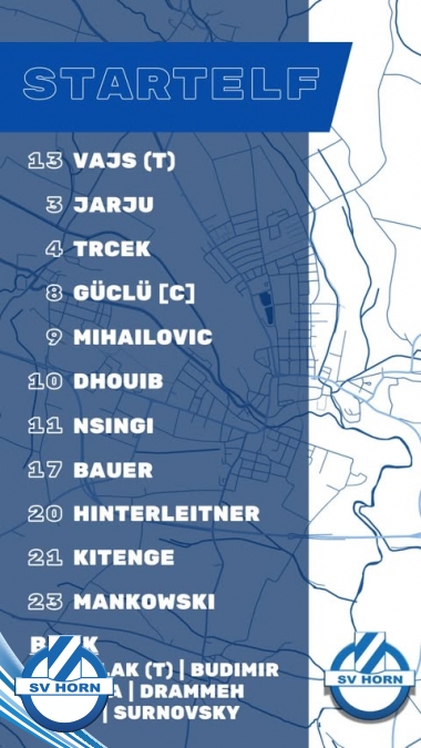 Der SV Horn spielte mit: Matej Vajs; Raphael Bauer, Nik Trcek, Alexander Mankowski, Seedy Jarju, Karim Dhouib, Rabbi Nsingi (HZ. Isa Drammeh), Joel Kitenge (80. Patrik Surnovsky), Julian Hinterleitner, Kürsat Güclü (K), Zoran Mihailovic (87. Simon Widor);