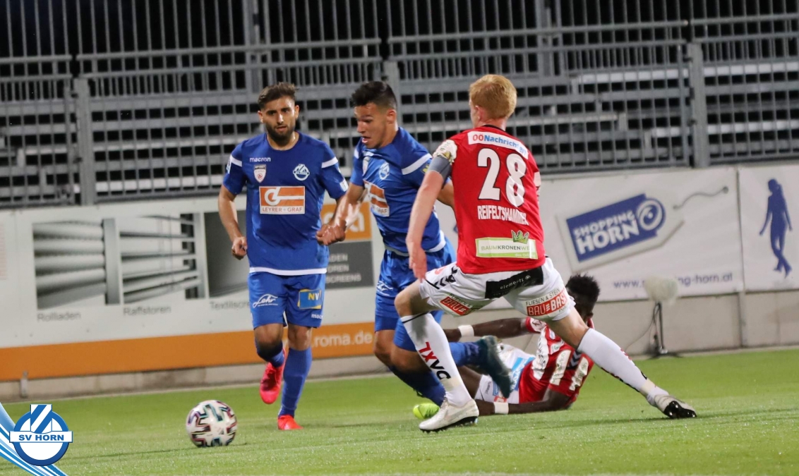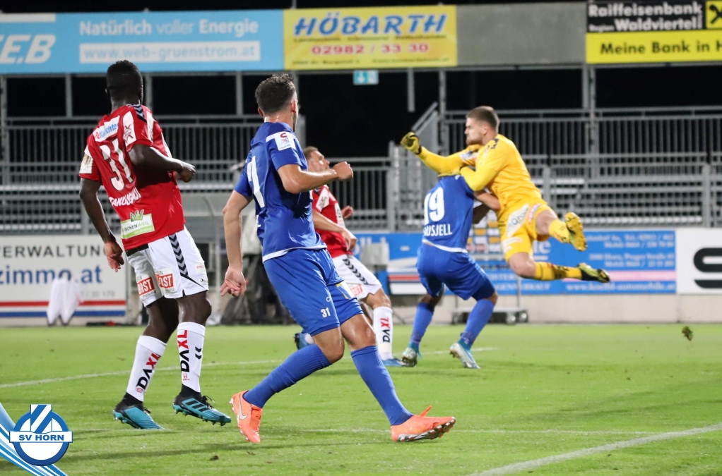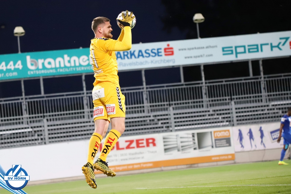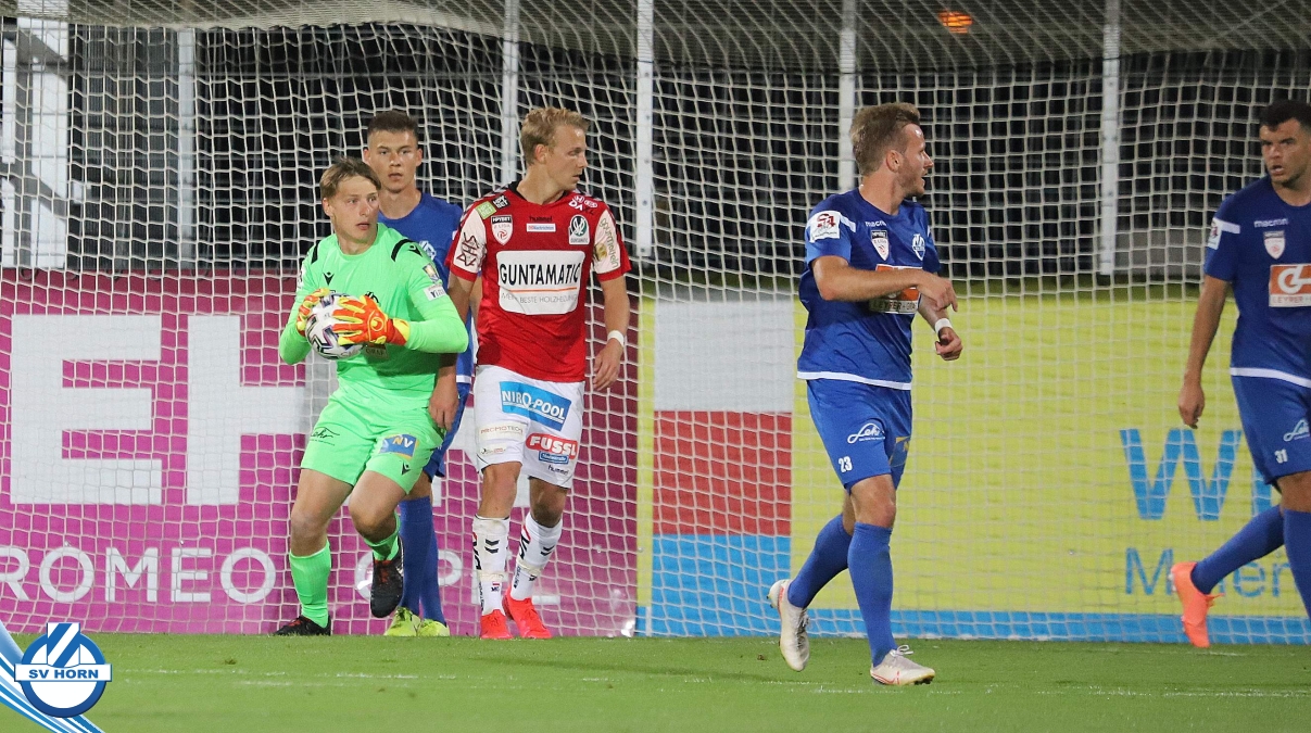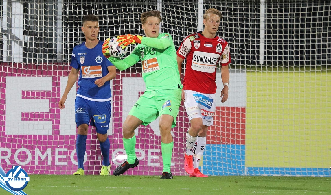 Ried jubelt über einen knappen Sieg in Horn und über die Tabellenführung. Der SV Horn hat die Partie zwar knapp verloren aber den Tabelleführer voll gefordert und der Rieder Torhüter hat letztlich für die Oberösterreicher einge male schließlich in der Schlußphase den Sieg festgehalten.