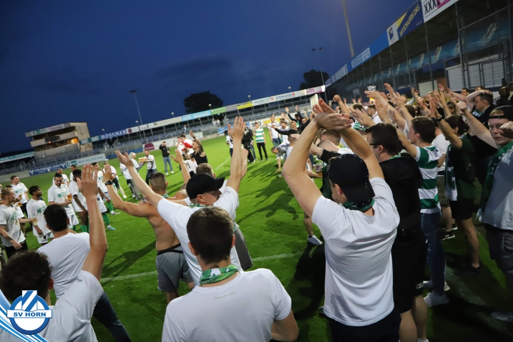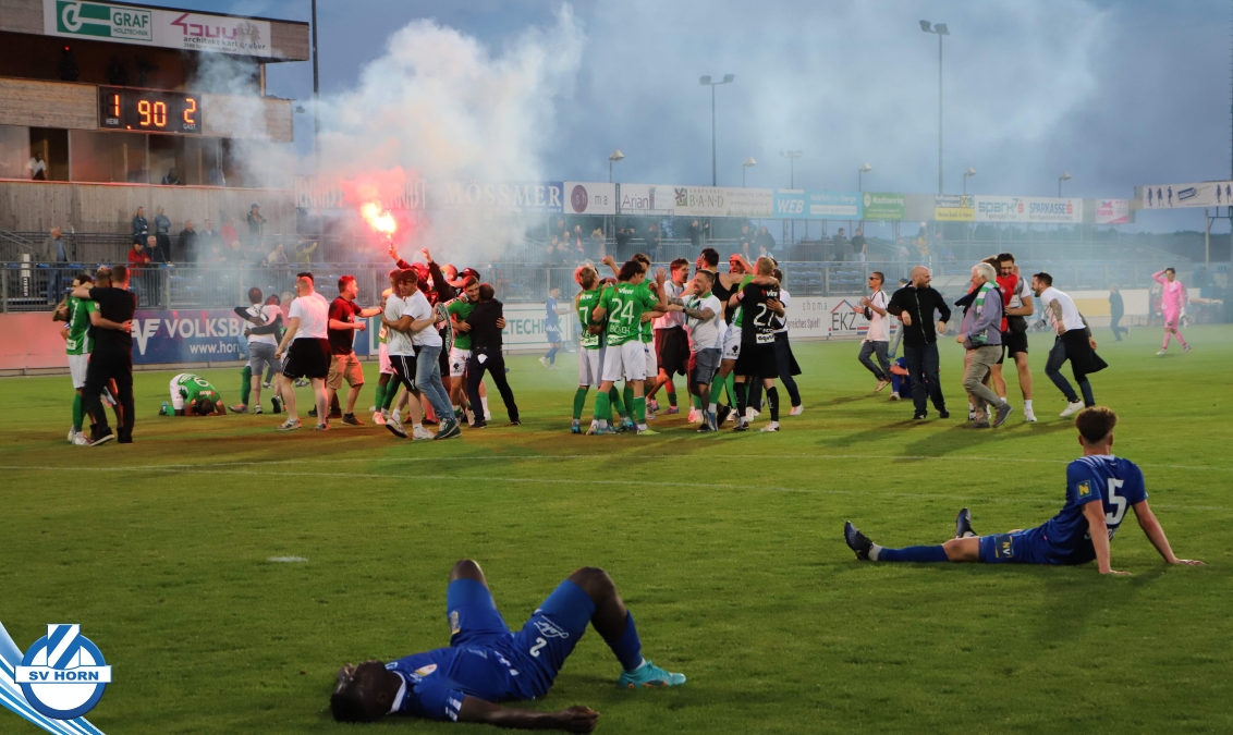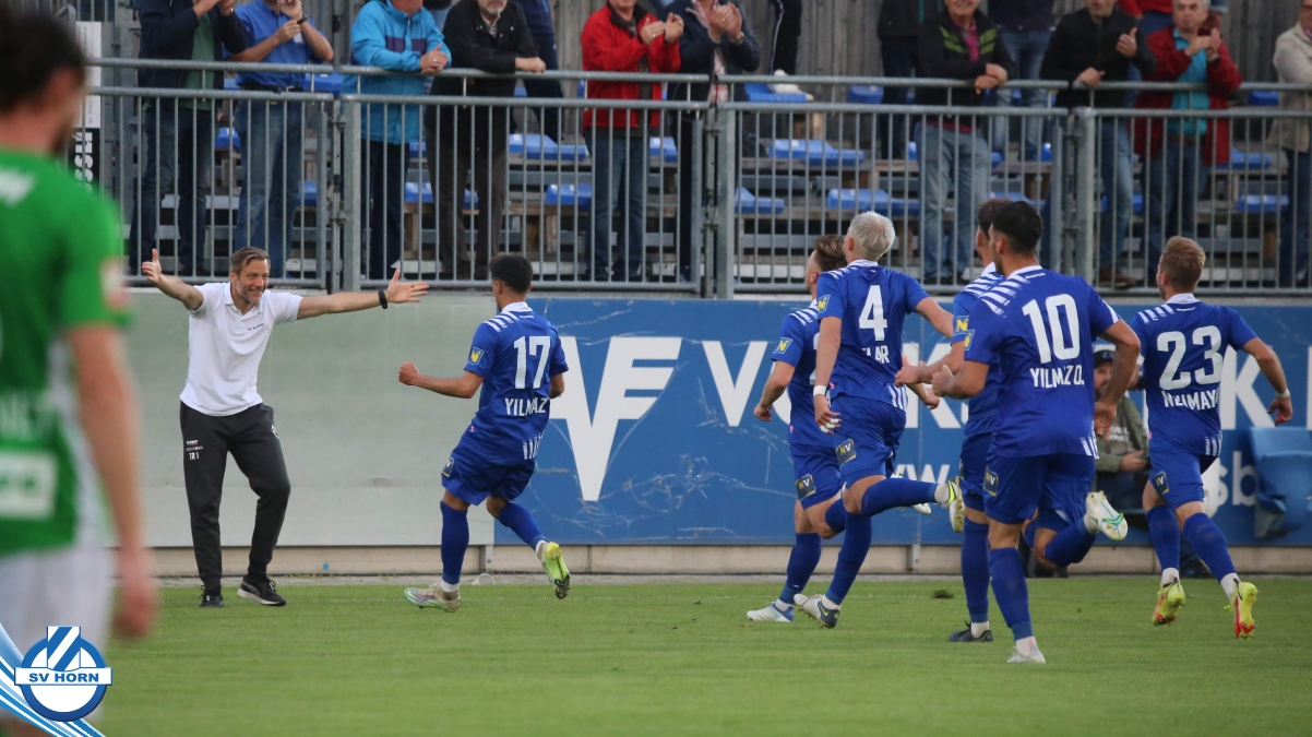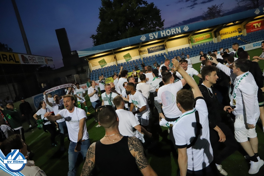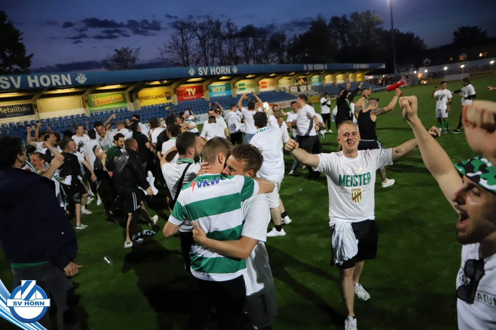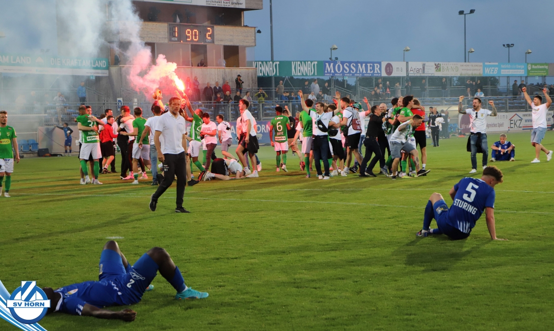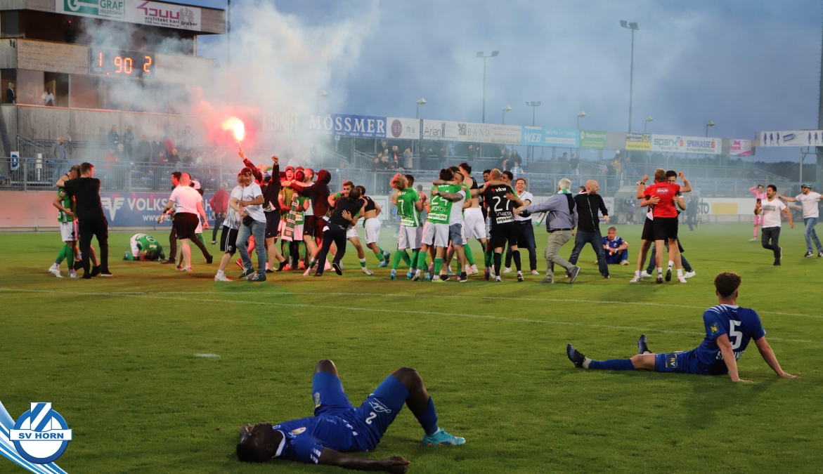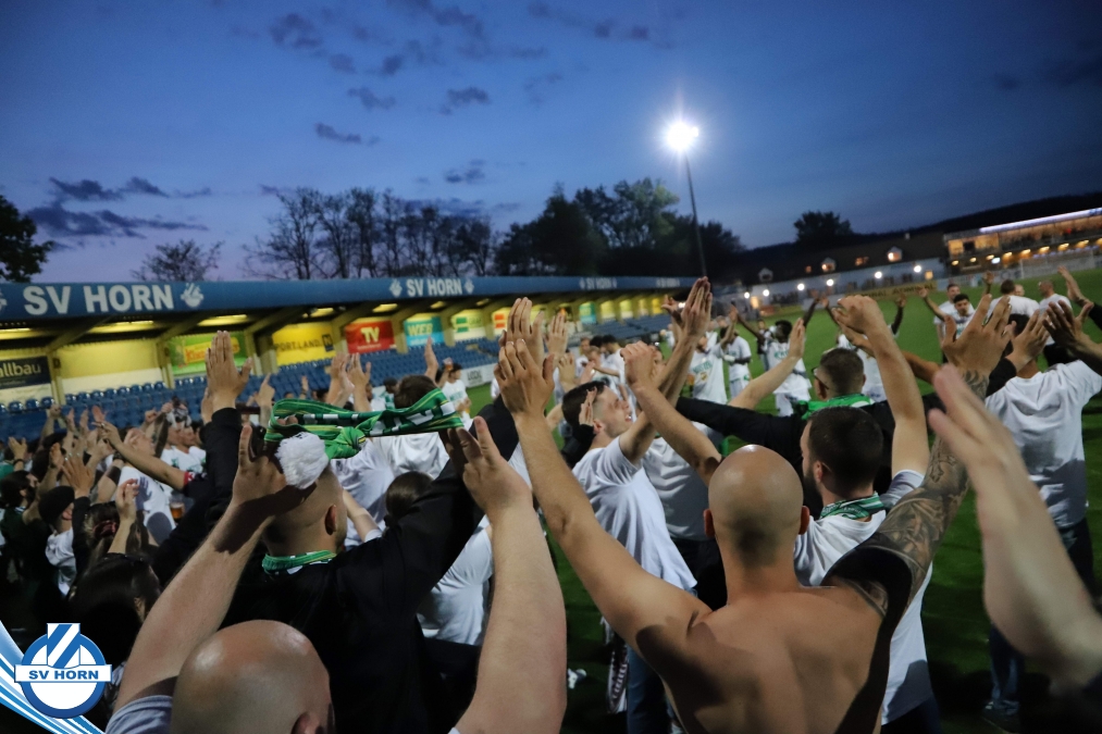 Nach Wiederanpfiff waren jedoch die Waldviertler am Drücker und kamen schnell zum Ausgleich. Burak Yilmaz versenkte einen Freistoß traumhaft und ließ die Fans jubeln. Plötzlich schwamm die Defensive des designierten Meisters und die Gastgeber hatten Chancen, um das Spiel komplett zu drehen. Jedoch scheiterten sowohl Okan Yilmaz als auch Albin Gashi am Austria-Keeper Schierl. Just in dieser starke Phase der Horner gingen die Lustenauer erneut in Führung. Der eingewechselte Teixeira setzte sich links gut durch und sein Stanglpass prallte vom Knie Gobaras ins Tor – zum zweiten Mal durften die Gäste nach einem Eigentor jubeln. In der Folge schwanden bei den Gastgebern zusehends die Kräfte und so gab es in der Schlussviertelstunde noch die eine oder andere Großchance für Austria Lustenau, die jedoch allesamt vergeben wurden. Weil auch die einzige nennenswerte Möglichkeit des SV Horn durch Albin Gashi vereitelt wurde, blieb es am Ende beim knappen Sieg der Vorarlberger. Durch die Niederlage des FAC in Lafnitz stand Austria Lustenau nach Schlusspfiff somit als Meister und Aufsteiger in die Bundesliga fest.