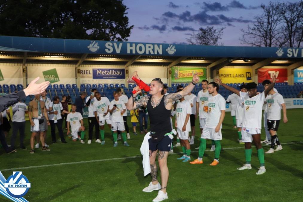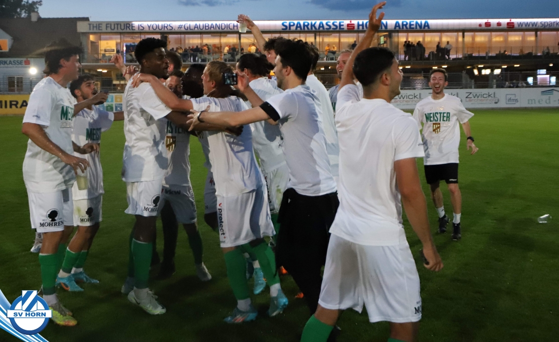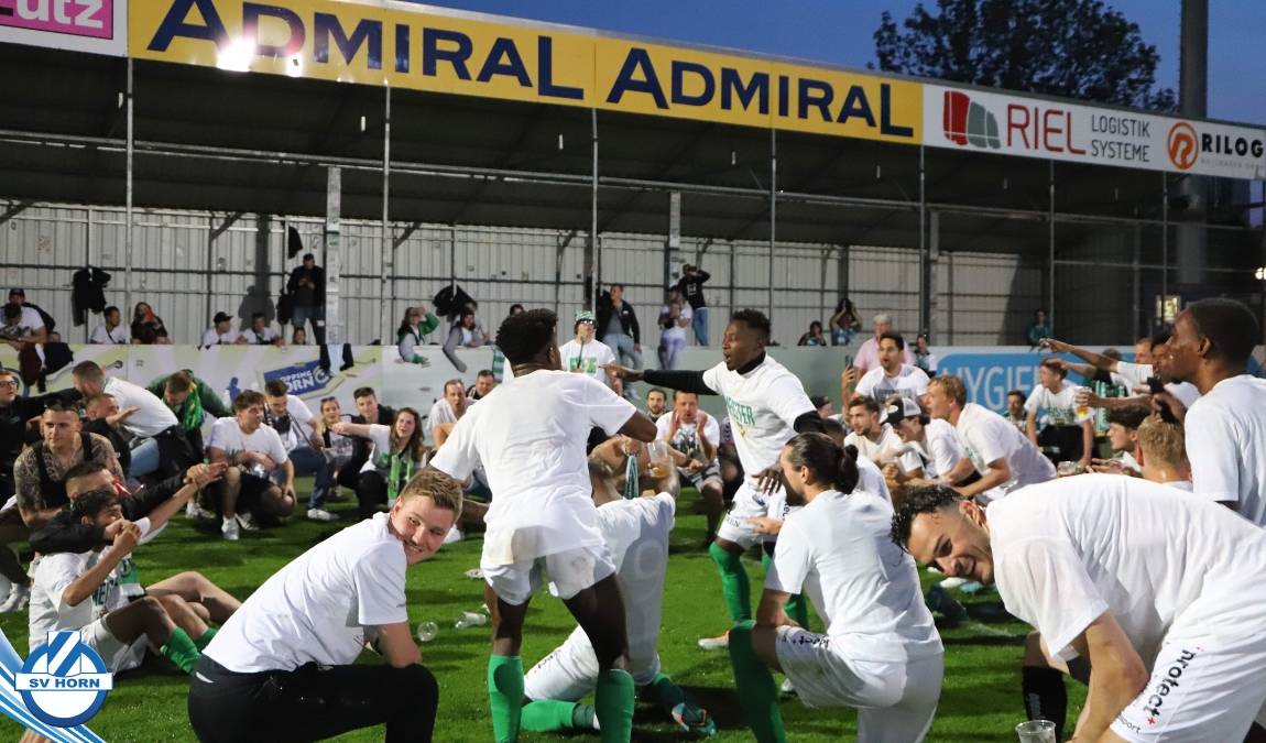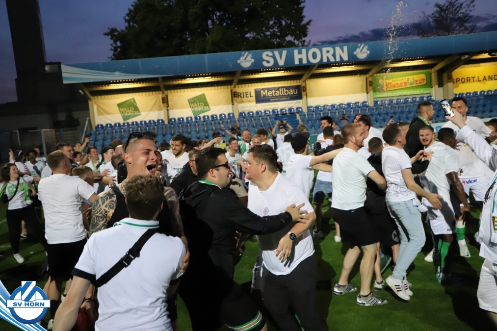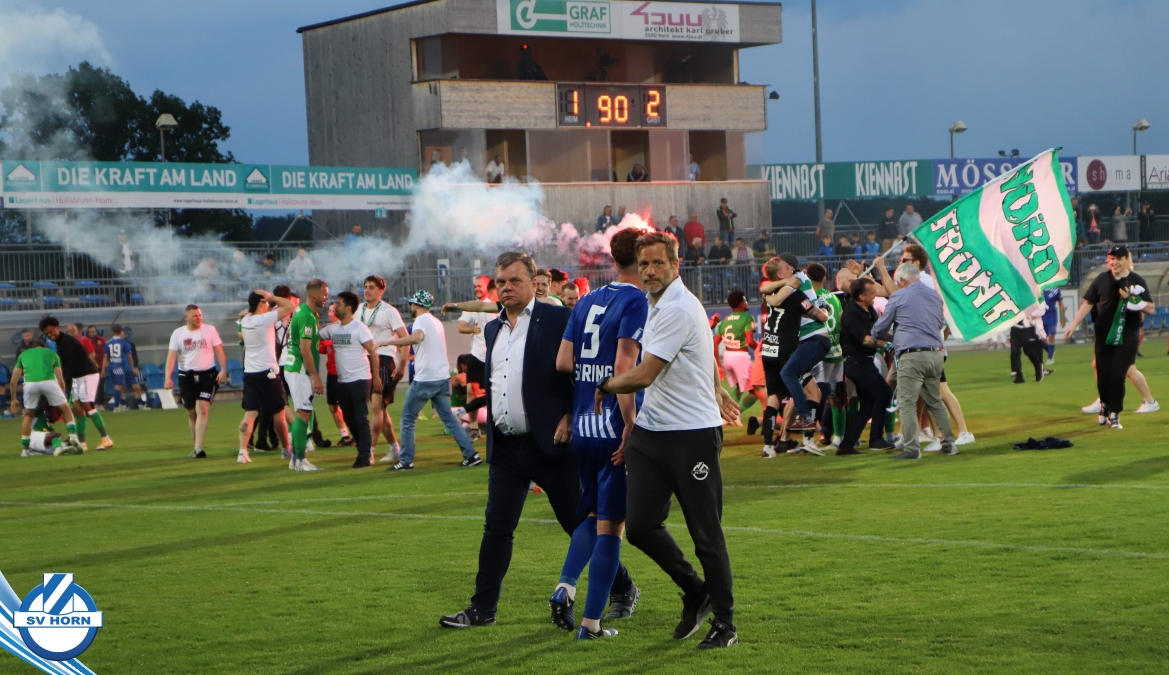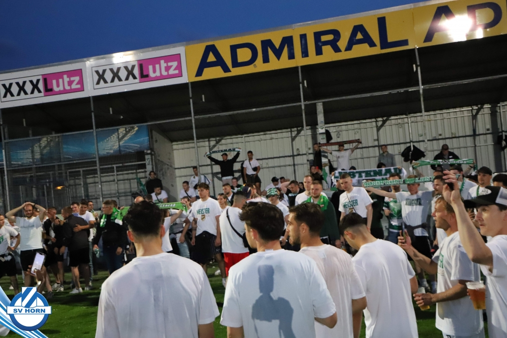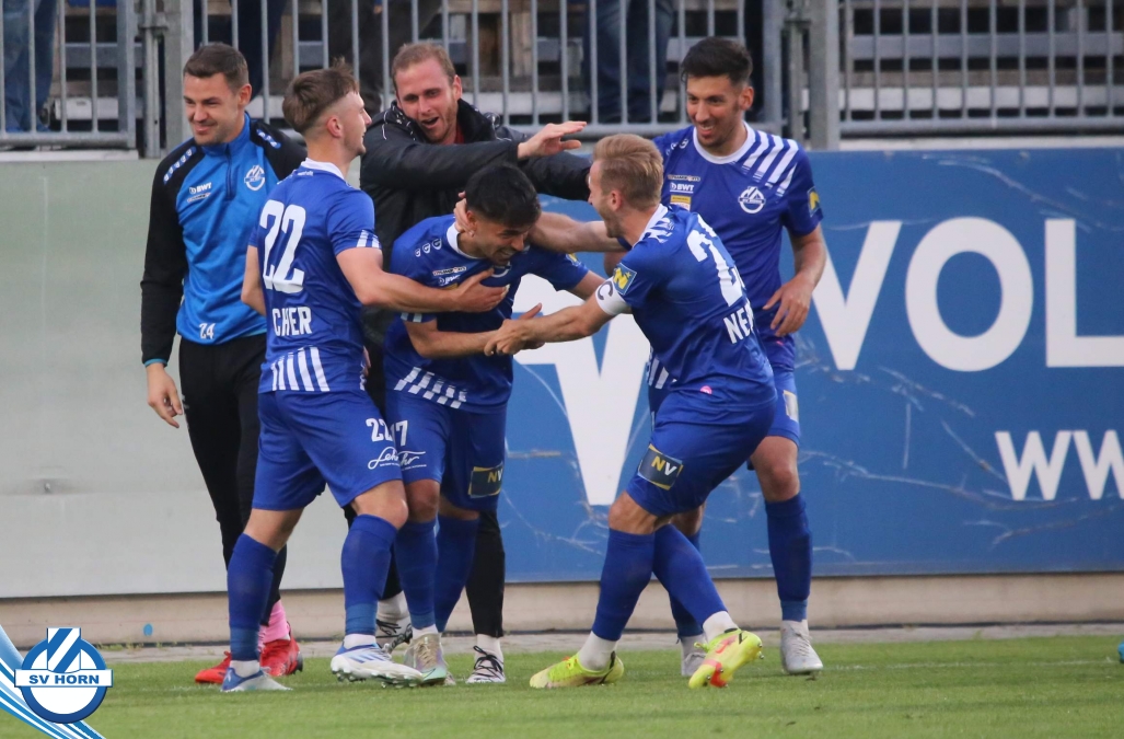 Nach Wiederanpfiff waren jedoch die Waldviertler am Drücker und kamen schnell zum Ausgleich. Burak Yilmaz versenkte einen Freistoß traumhaft und ließ die Fans jubeln. Plötzlich schwamm die Defensive des designierten Meisters und die Gastgeber hatten Chancen, um das Spiel komplett zu drehen. Jedoch scheiterten sowohl Okan Yilmaz als auch Albin Gashi am Austria-Keeper Schierl. Just in dieser starke Phase der Horner gingen die Lustenauer erneut in Führung. Der eingewechselte Teixeira setzte sich links gut durch und sein Stanglpass prallte vom Knie Gobaras ins Tor – zum zweiten Mal durften die Gäste nach einem Eigentor jubeln. In der Folge schwanden bei den Gastgebern zusehends die Kräfte und so gab es in der Schlussviertelstunde noch die eine oder andere Großchance für Austria Lustenau, die jedoch allesamt vergeben wurden. Weil auch die einzige nennenswerte Möglichkeit des SV Horn durch Albin Gashi vereitelt wurde, blieb es am Ende beim knappen Sieg der Vorarlberger. Durch die Niederlage des FAC in Lafnitz stand Austria Lustenau nach Schlusspfiff somit als Meister und Aufsteiger in die Bundesliga fest.