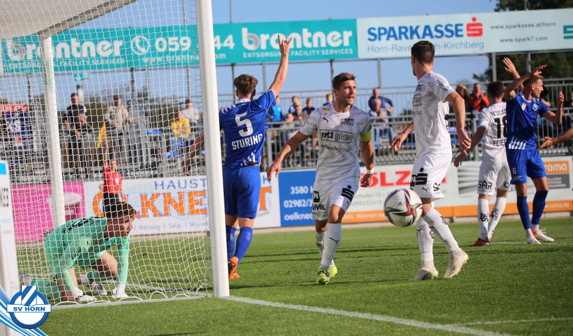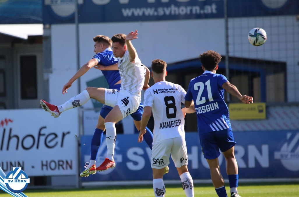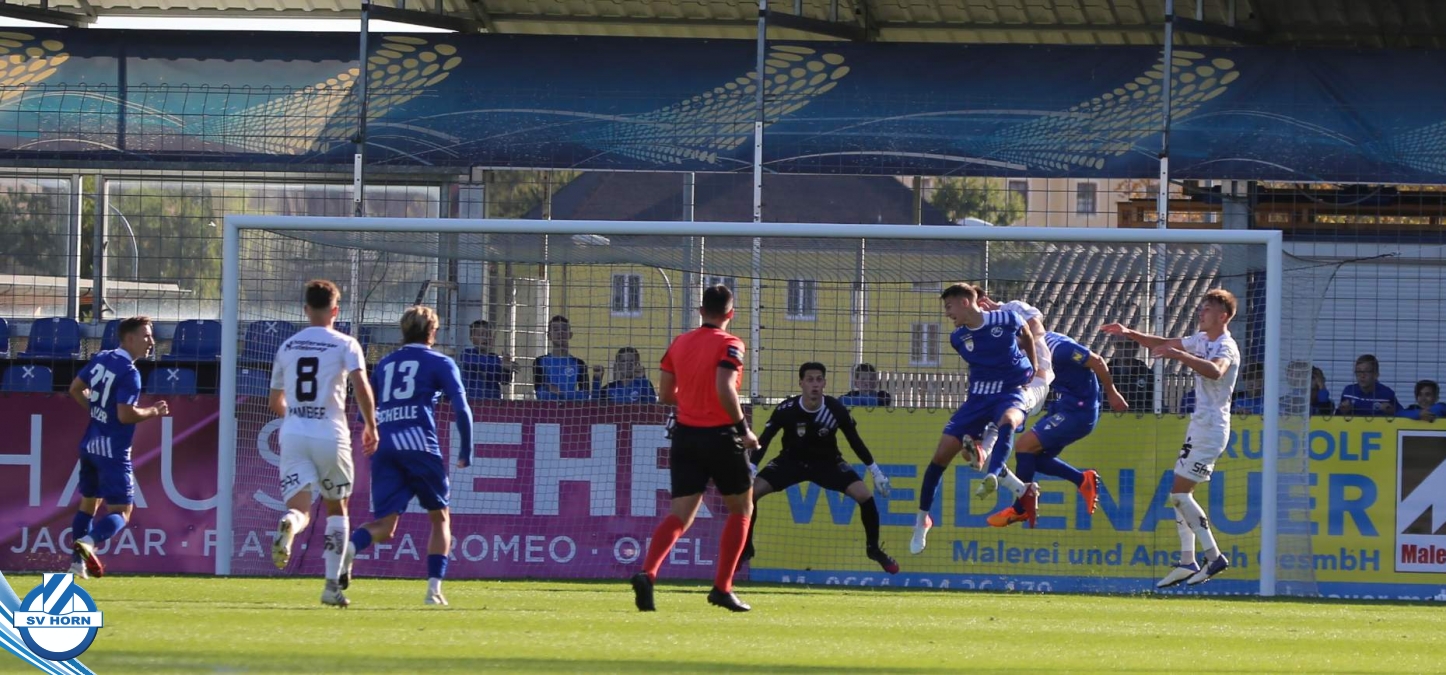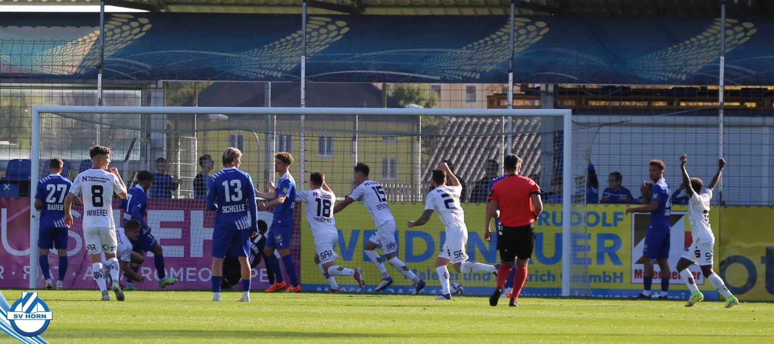 Das Spiel begann sehr ausgeglichen, beide Teams waren schnell in der Partie. Die Gastgeber waren optisch überlegen, ohne jedoch zu zwingenden Torchancen zu kommen. Die erste gefährliche Aktion gehörte auch den Gästen, nach einem Corner musste Horn-Keeper Ehmann retten. Auf der Gegenseite wurden die Horner nur einmal richtig gefährlich, doch der Abschluss von Schelle fiel zu zentral aus. Die großen Aufreger blieben Mangelware – die eine oder andere gute Situation spielten die Gastgeber im letzten Drittel nicht gut aus (Cosgun, Toro) - doch als die Zuschauer schon mit einem folgerichtigen torlosen Remis zur Pause rechneten, überschlugen sich in den Schlussminuten der ersten Halbzeit die Ereignisse. Zunächst kamen die Mostviertler nach einer Standardsituation durch Schellnegger zur überraschenden Führung und nur drei Minuten später patzte Goalie Ehmann folgenschwer. Er traf bei einem Abschlag den heranstürmenden Feiertag und von diesem prallte der Ball ins leere Tor.