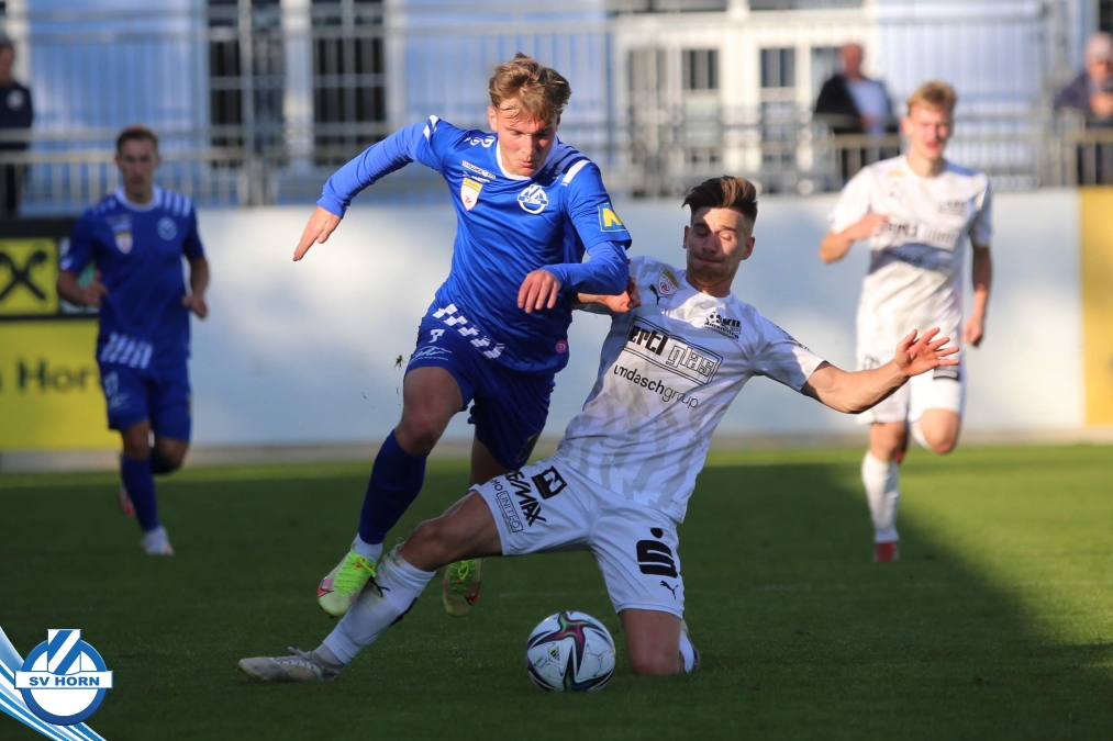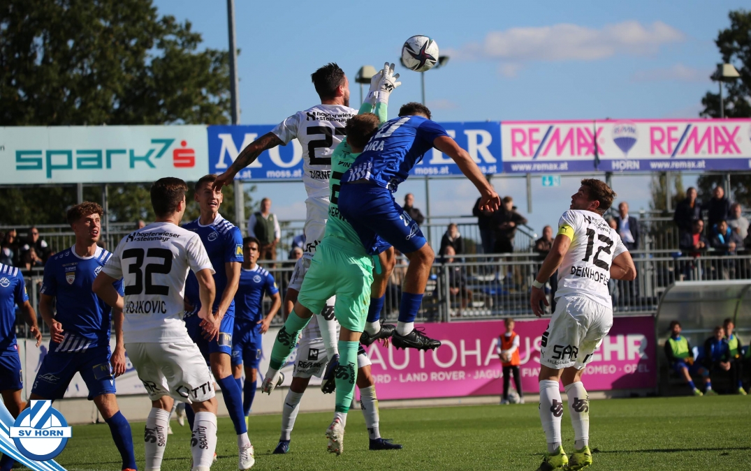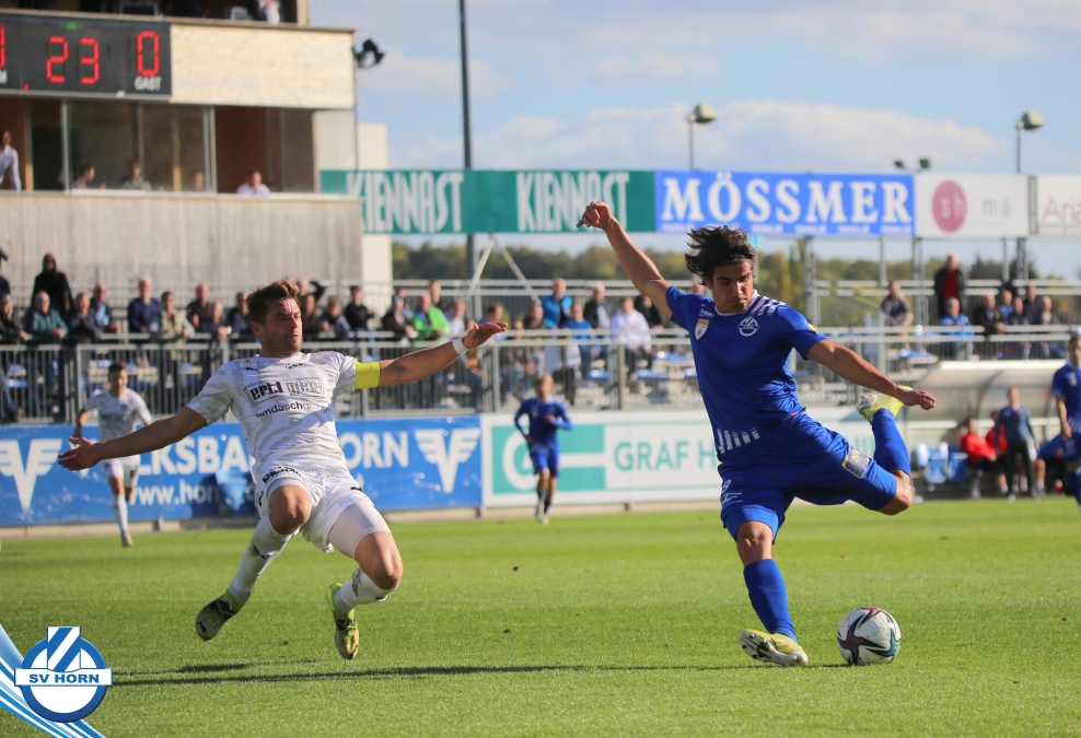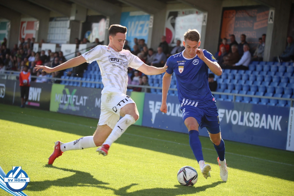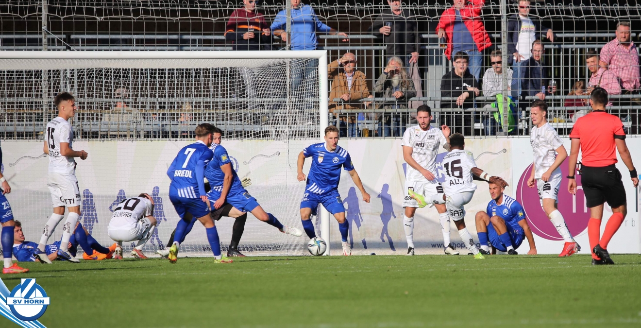 Das Spiel begann sehr ausgeglichen, beide Teams waren schnell in der Partie. Die Gastgeber waren optisch überlegen, ohne jedoch zu zwingenden Torchancen zu kommen. Die erste gefährliche Aktion gehörte auch den Gästen, nach einem Corner musste Horn-Keeper Ehmann retten. Auf der Gegenseite wurden die Horner nur einmal richtig gefährlich, doch der Abschluss von Schelle fiel zu zentral aus. Die großen Aufreger blieben Mangelware – die eine oder andere gute Situation spielten die Gastgeber im letzten Drittel nicht gut aus (Cosgun, Toro) - doch als die Zuschauer schon mit einem folgerichtigen torlosen Remis zur Pause rechneten, überschlugen sich in den Schlussminuten der ersten Halbzeit die Ereignisse. Zunächst kamen die Mostviertler nach einer Standardsituation durch Schellnegger zur überraschenden Führung und nur drei Minuten später patzte Goalie Ehmann folgenschwer. Er traf bei einem Abschlag den heranstürmenden Feiertag und von diesem prallte der Ball ins leere Tor.