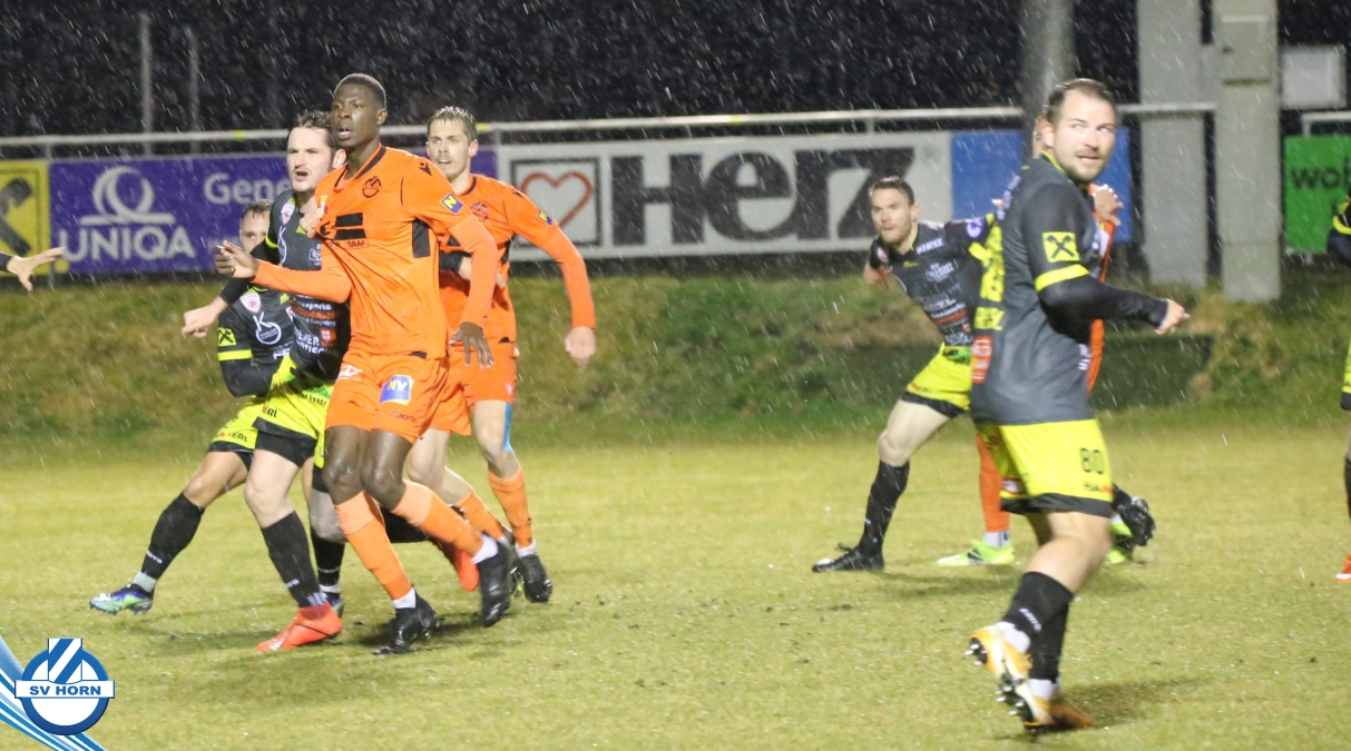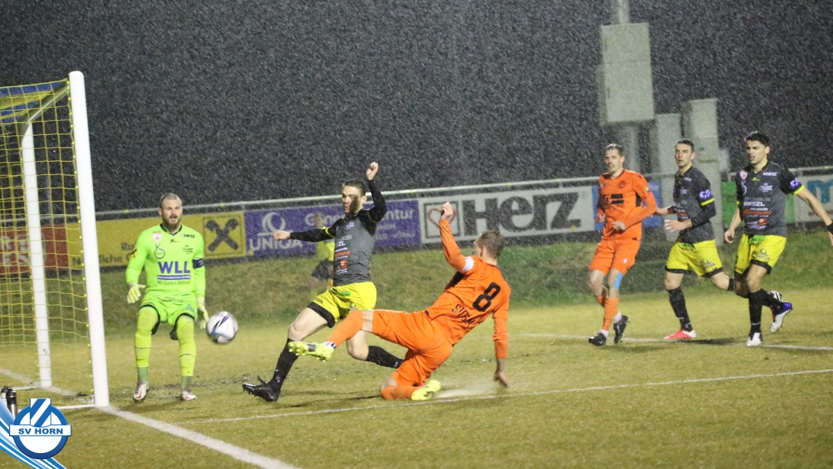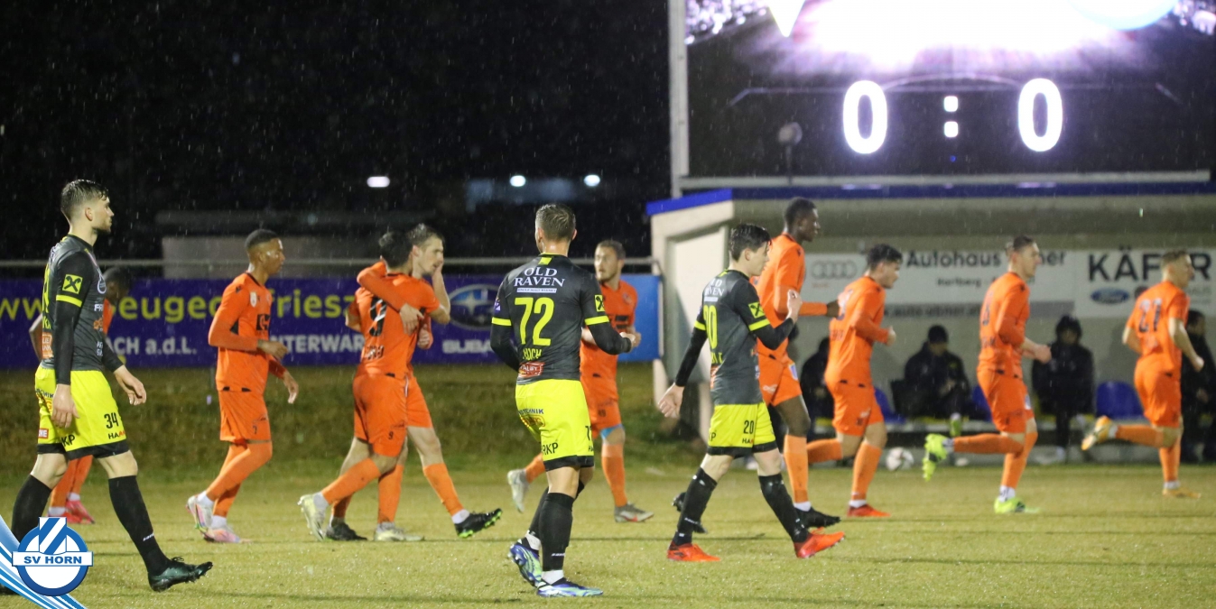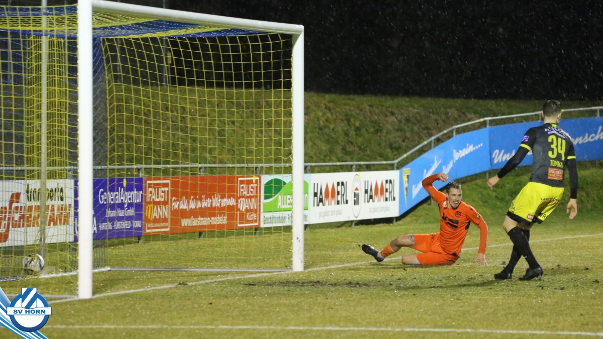 Bei strömendem Regen starteten die Horner gut in die Partie und zeigten von Beginn an, dass sie dem Tabellenführer ebenbürtig sein können. Nachdem Eler kurz zuvor schon eine gute Chance vergeben hatte, konnte er in der 16. Minute jubeln. Nach einem Pass von Bauer spitzelte er den Ball im Rutschen an Lafnitz-Goalie Zingl vorbei ins Tor. Nur vier Minuten später hatte Wendler die große Möglichkeit zum Ausgleich, doch Horn-Keeper Antosch konnte sich auszeichnen. In der Folge entwickelte sich ein offener Schlagabtausch mit Chancen auf beiden Seiten, weitere Treffer blieben vor dem Pausenpfiff aus.