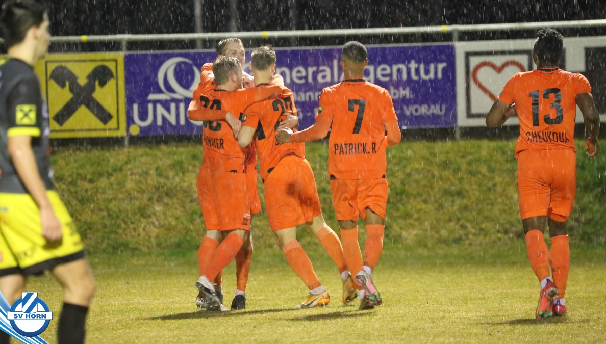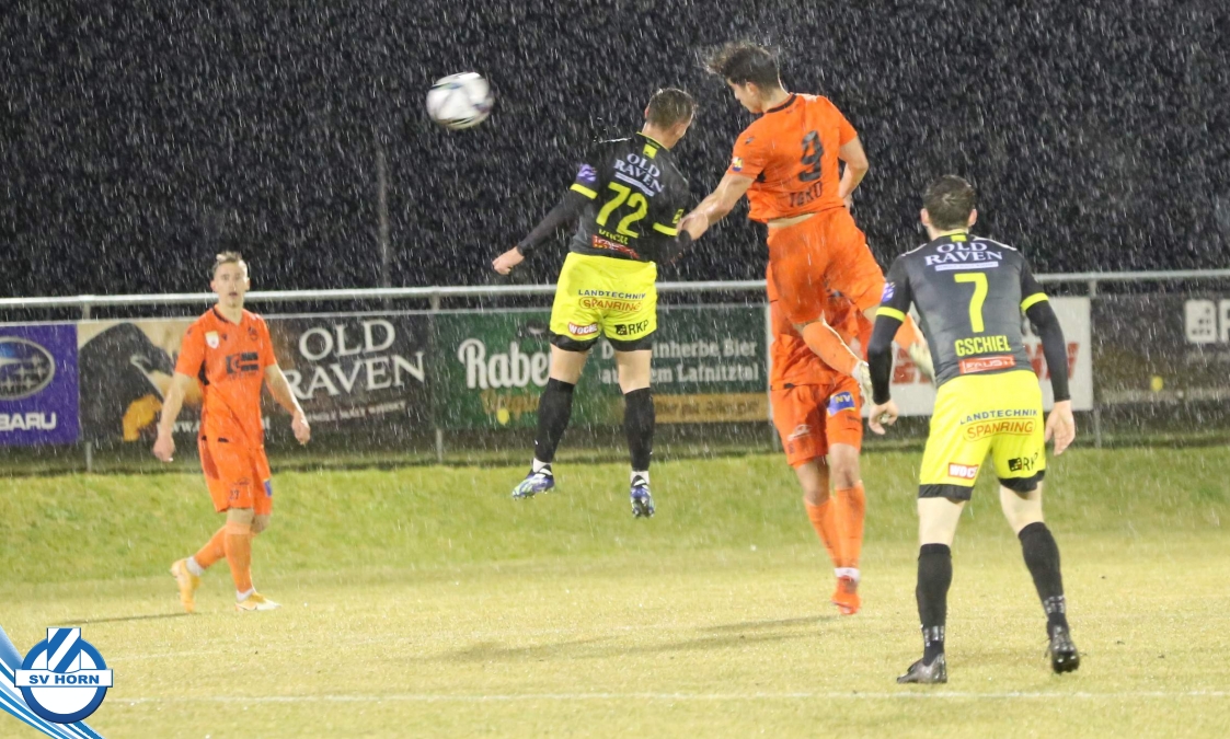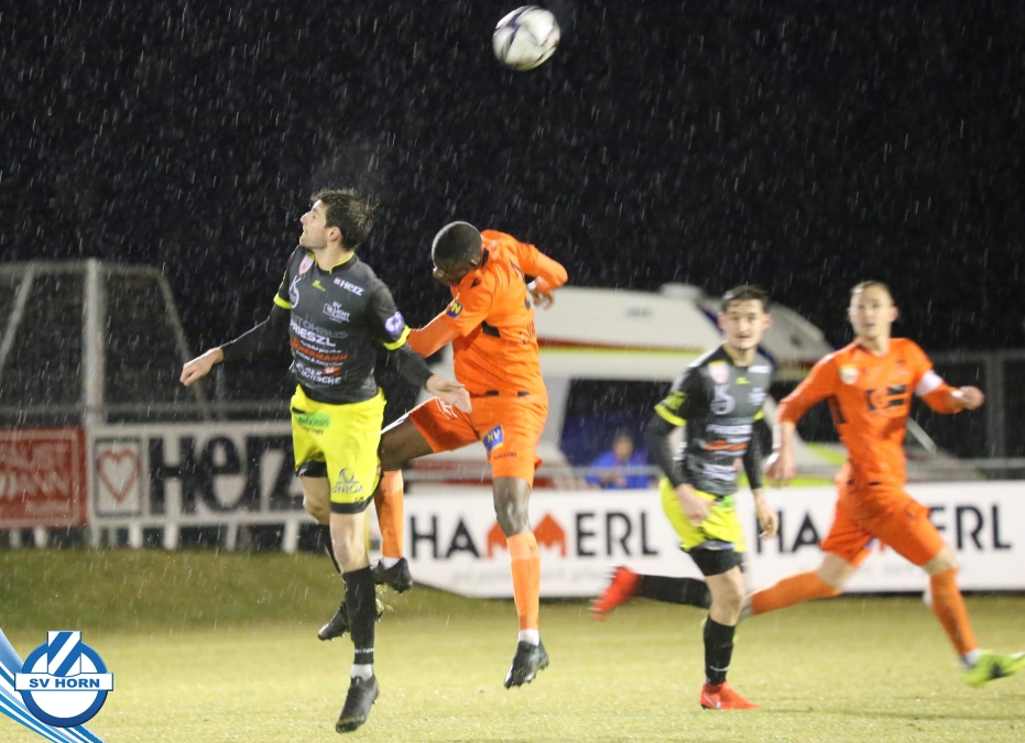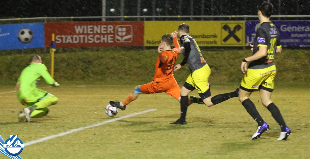 Bei strömendem Regen starteten die Horner gut in die Partie und zeigten von Beginn an, dass sie dem Tabellenführer ebenbürtig sein können. Nachdem Eler kurz zuvor schon eine gute Chance vergeben hatte, konnte er in der 16. Minute jubeln. Nach einem Pass von Bauer spitzelte er den Ball im Rutschen an Lafnitz-Goalie Zingl vorbei ins Tor. Nur vier Minuten später hatte Wendler die große Möglichkeit zum Ausgleich, doch Horn-Keeper Antosch konnte sich auszeichnen. In der Folge entwickelte sich ein offener Schlagabtausch mit Chancen auf beiden Seiten, weitere Treffer blieben vor dem Pausenpfiff aus.