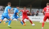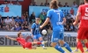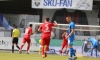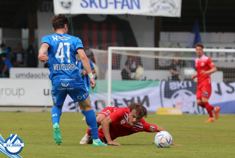 Dieses NÖ-Derby begann bei sommerlichen Temperaturen äußerst verhalten und es dauerte zwanzig Minuten, ehe erstmals gefährlich wurde. Nach einer Ecke stieg Raphael Bauer hoch und köpfte mit seinem ersten Tor für den SV Horn zur Führung ein. Praktisch im Gegenzug stand dann Weixelbraun plötzlich ganz alleine vor Horn-Keeper Hotop, doch sein Heber ging über das Tor. Dies war dann lange Zeit das letzte Highlight, bevor es kurz vor der Pause turbulent wurde. Nach einem langen Pass stand Feiertag frei im Strafraum und Hoffmann konnte sich nur noch mit einem Foul behelfen. Schiedsrichter Barmaksiz entschied richtigerweise auf Elfmeter und zeigte dem Horner Innenverteidiger zusätzlich die rote Karte – eine viel zu harte Entscheidung! Den Strafstoß verwandelte Feiertag sicher zum Pausenstand.